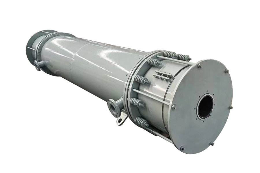 由氣液分布器、吸收冷卻段和氣液分離器三部分組成。氣液分布器由氣體液體進口管、穩壓環、配液管等不透性石墨件構成。從進口管輸入的吸收液經穩壓環底部的環隙進入上管板(或吸收換熱塊)上面的空間后,呈均勻分布狀態進入配液管。配液管亦稱導流管或溢流管,其上部開有均勻分布的4個V形切口,切口的一邊與管內壁相切。吸收液沿切向進入,在管內形成螺旋狀擾動液膜下降。吸收冷卻段按結構型式分,有浮頭列管式和圓塊孔式兩種,他們的結構分別類同于列管式和圓孔式石墨熱交換器。下降至吸收冷卻段的吸收液沿著管(或孔)內壁呈膜狀流下,易溶于吸收液的氣體同向流動,與吸收液充分接觸,被吸收。溶解熱通過間壁傳遞給冷卻液帶出設備。未被吸收的氣體與產品一起進入位于設備底部提供分離空間的氣液分離器。分離后,氣體被送往尾氣塔,產品輸入貯槽 。